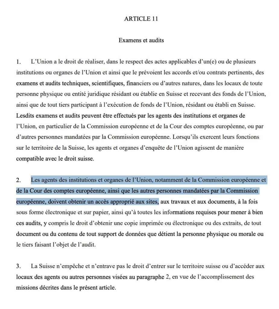 Je vous donne juste un extrait ressortant du Pacte 12, art. 11, page 25 : 2. « Les agents des institutions et organes de l’Union, notamment de la Commission européenne et de la Cour des comptes européenne, ainsi que les autres personnes mandatées par la Commission européenne, doivent obtenir un accès approprié aux sites (…) » 3. « La Suisse n’empêche et n’entrave pas le droit d’entrer sur le territoire suisse ou d’accéder aux locaux des agents ou autres personnes visées au paragraphe 2, en vue de l’accomplissement des missions décrites dans le présent article. »